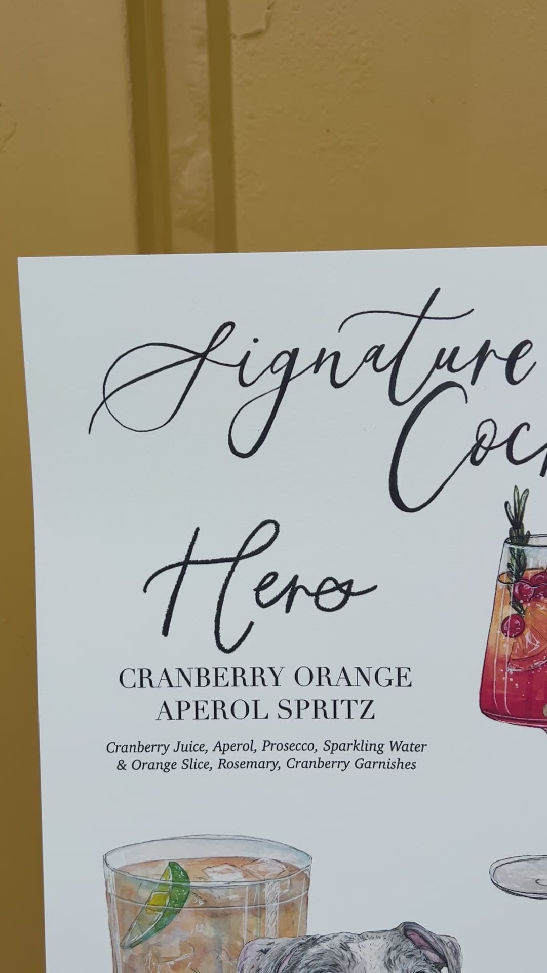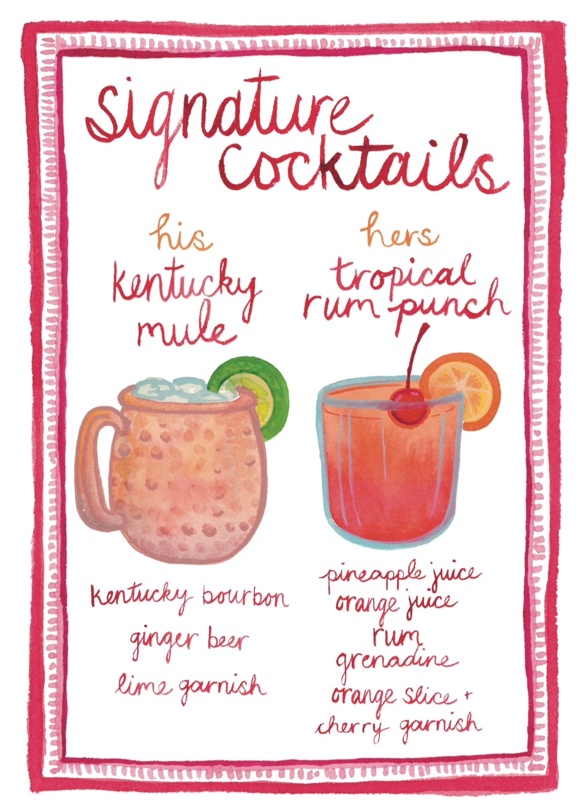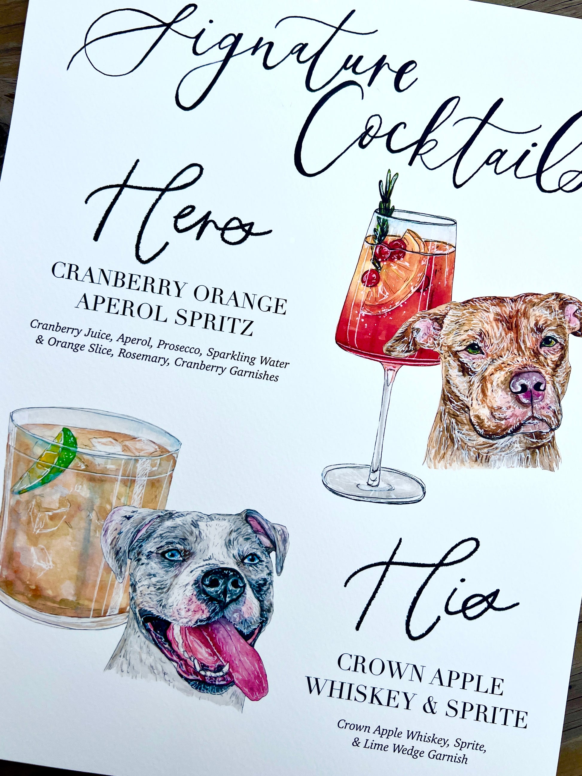 Custom Watercolor Cocktail Sign: custom signature cocktail sign featuring 1-3 cocktails and pets (if desired). All elements hand painted and combined digitally for clean text and the option to rearrange if needed.