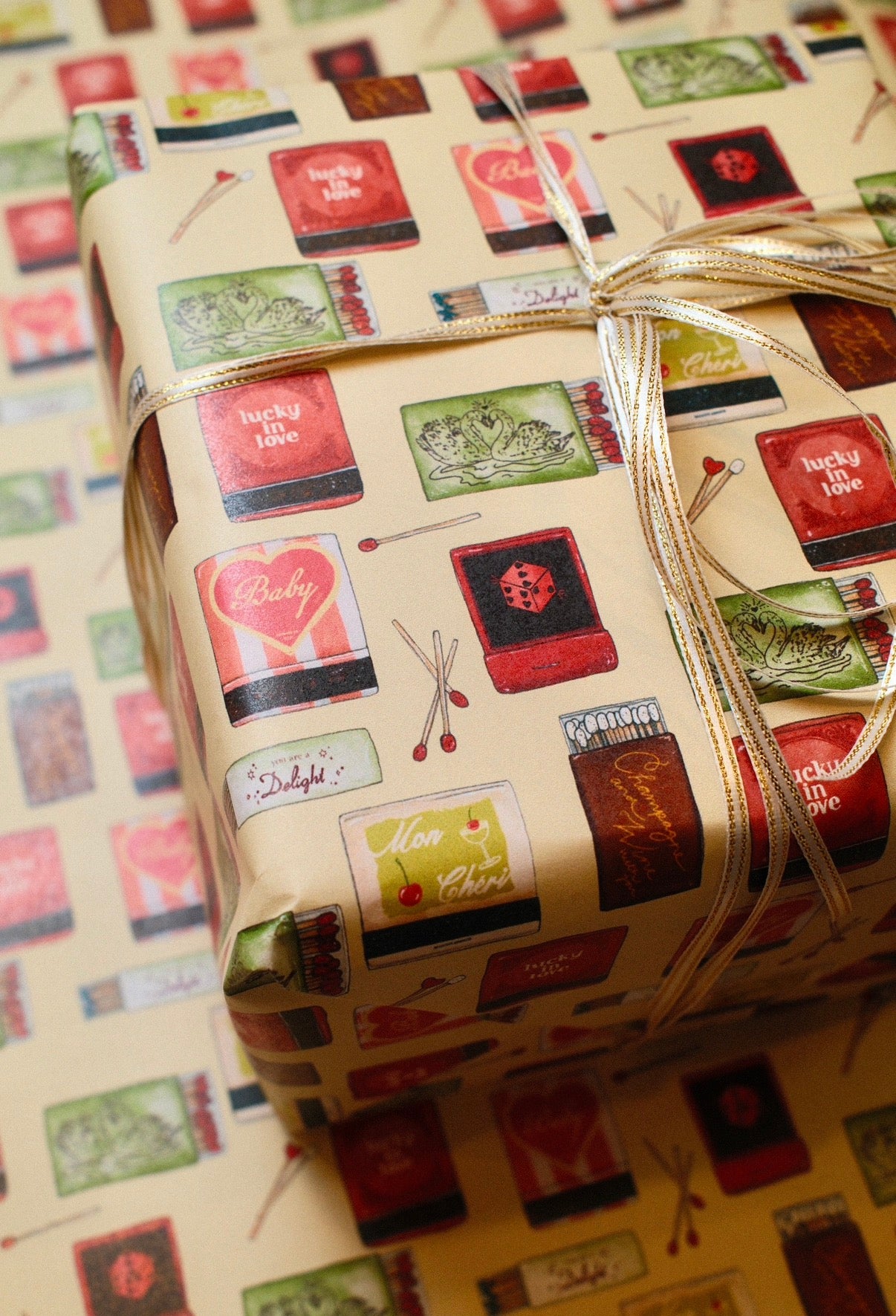 Pattern features an array of matches, matchbooks, and matchboxes depicting icons of love and text reading "Mon Cheri", "Lucky in Love", "Baby", and "Champagne and Wine with You".