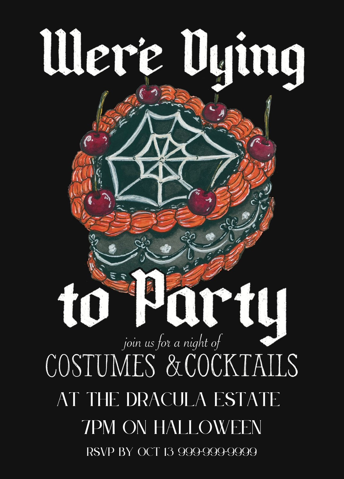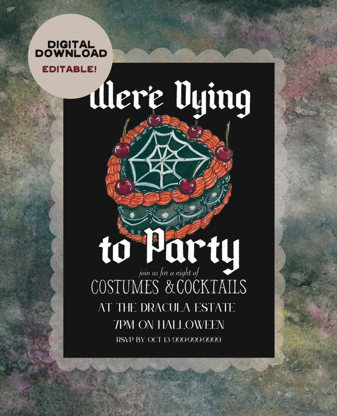You can edit: invitation details text (font, color, size as well). Some text elements (headings) will be hand painted/hand drawn and are NOT editable- all personalized details however are editable. For this specific invitation, "We're Dying to Party" and "join us for a night of costumes and cocktails" are hand-drawn and NOT editable. All other text IS editable.