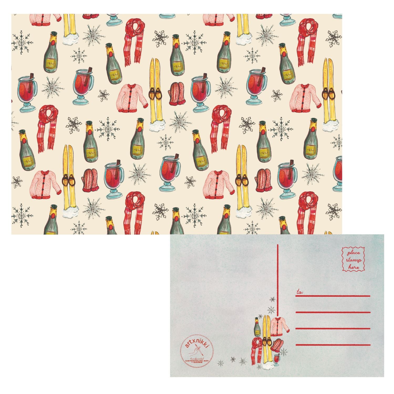 Winter Icons Post Card features a hand drawn illustration featuring an array of cheerful winter icons including aprés ski champagne and mulled wine, warm knit clothes, skis, and a variety of snowflakes. Backside has blue hue and features a traditional postcard layout with a place for a message, stamp, and recipient address.